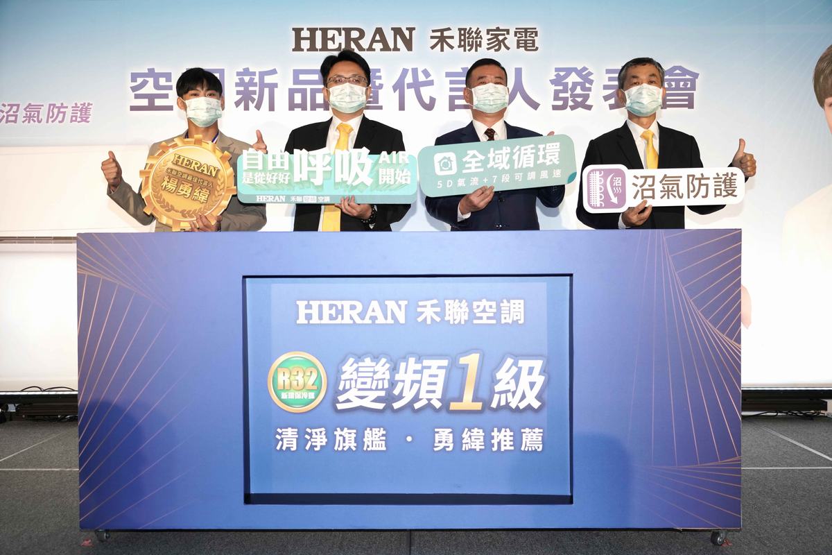 ▲禾聯家電新品暨新代言人發表會儀式(由左至右分別為代言人楊勇緯、禾聯碩股份有限公司蔡柏毅副董事長、國策顧問暨家電公會廖全平理事長、禾聯碩股份有限公司林欽宏總經理)(圖片提供/HERAN禾聯家電)