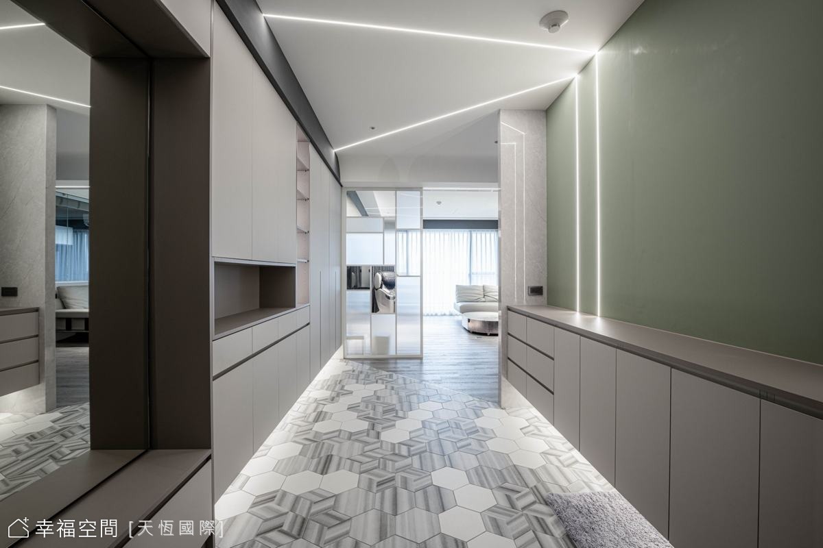▲ 玄關利用灰白色系的六角花磚鋪陳落塵區,並以斜切角度銜接木地板,既清楚界定內外關係,亦藉由轉折路徑帶來別樣的空間情趣。(圖片提供/天恆國際)