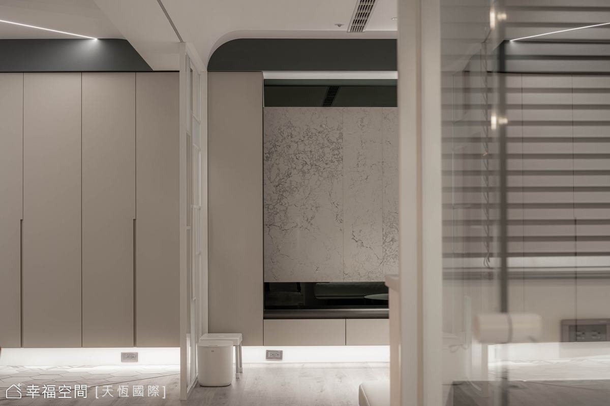 ▲大尺度的石材牆面容易落入單調制式,對此,曾冠祥設計師將主牆左右兩側加厚,並於上下加設黑玻及嵌燈,透過不同材質、顏色及明暗的層次堆疊,使空間在豎向視覺變得更為豐富。(圖片提供/天恆國際)
