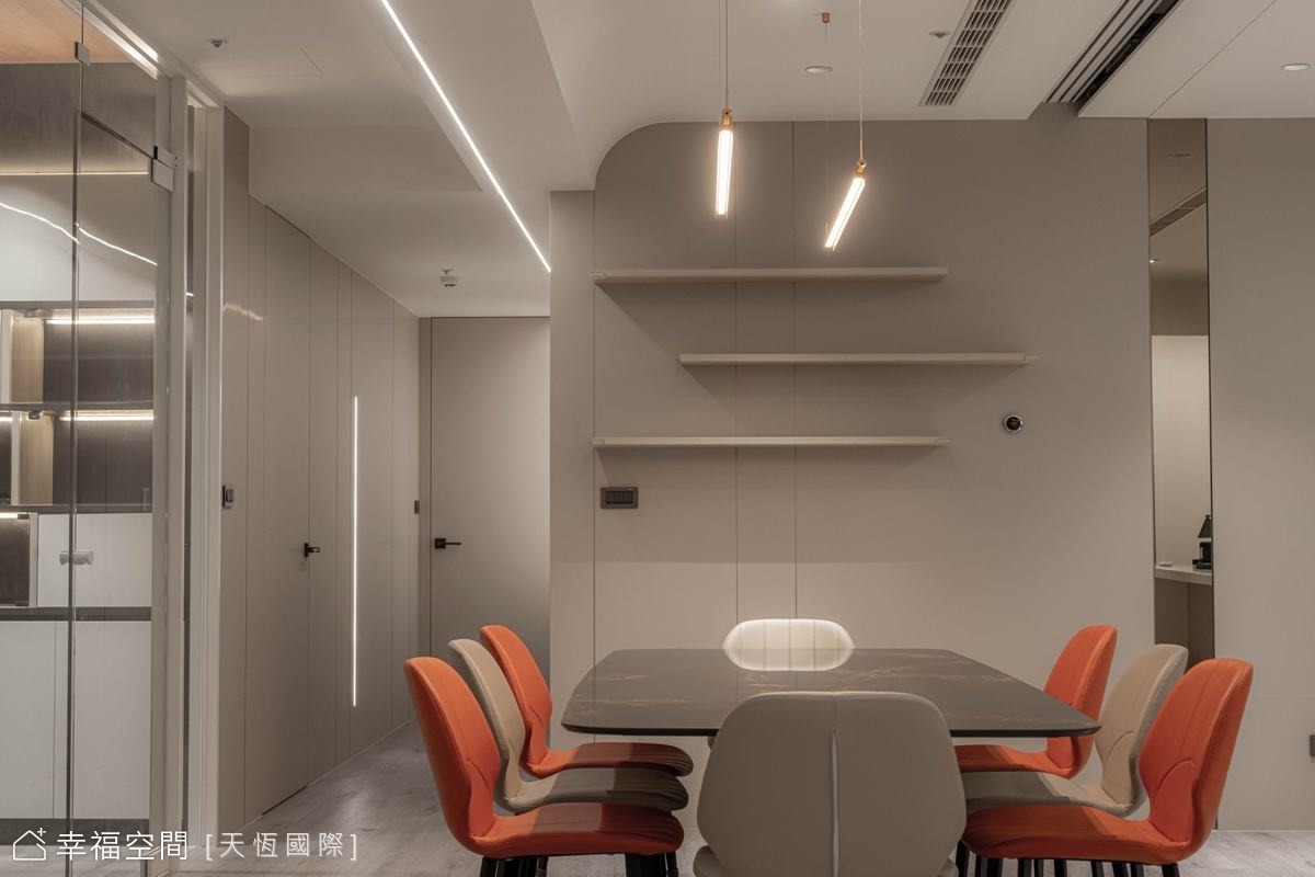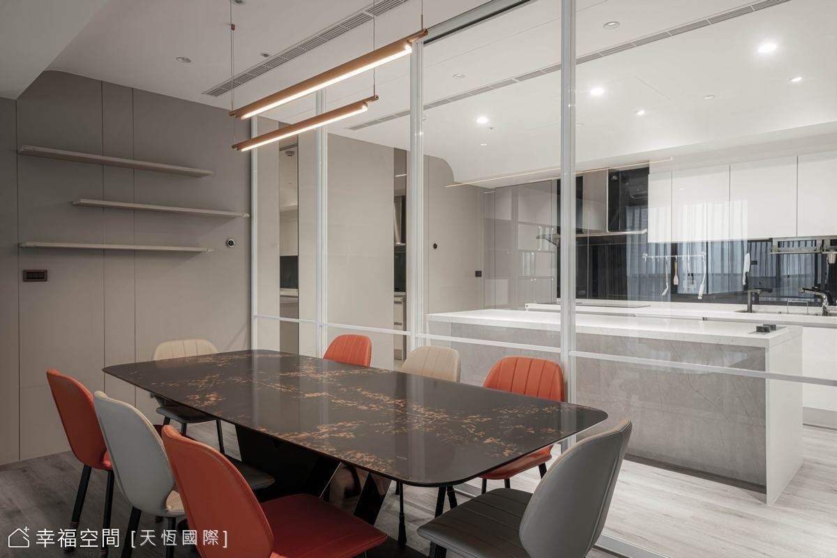 循著線性燈帶的指引來到餐廳區,這裡佔據了場域的軸心位置,為朋友聚會、餐敘時光留有最舒適的交流空間。跳脫靜謐柔和的氛圍,丹一設計期望以特有的意境與情調,賦予熱鬧、歡快的就餐感受,因此,選用天恆國際的「矽鋼石-國際版-璀璨金」,砌造可容納多人座位的宴客桌,並汲取其充滿戲劇張力的強烈底色,讓色香味俱全的佳餚更為突出,達到美味與品味相得益彰的雙重饗宴。