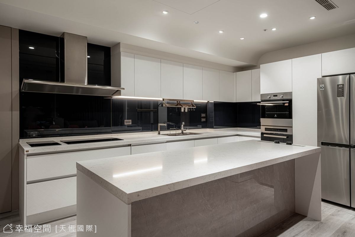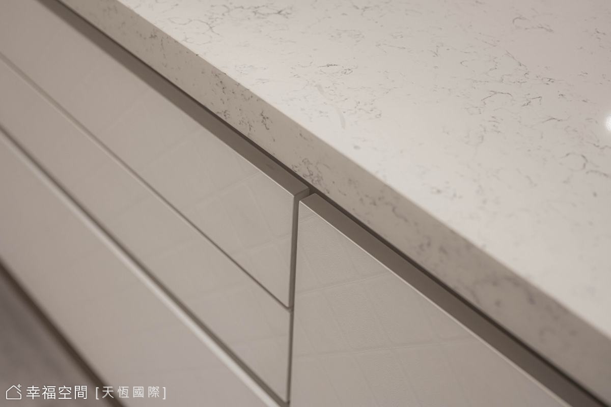 對曾冠祥設計師來說,廚房是一家人幸福感的泉源,關於食材與味蕾的組合想像,在女主人的巧手下,化為一道道溫暖心脾的飯菜,這種發自內心的愛,藏著的是一顆熱愛生活的心、一種把平凡日子過成詩的氣質。呼應侘寂風格的純色景致,廚房中央擺置尺度寬闊的中島吧台,檯面襯以天恆國際淨白純粹、紋路細膩的矽鋼石,藉由與空間氛圍相吻的質地,構築能隨心所欲施展廚藝的優雅空間。其次,耐用度與好清潔也是廚房設計的一大重點,設計師說道:「採用天恆國際矽鋼石打造的流理檯面,平時以菜瓜布加上溫和的清潔劑刷洗,輕輕鬆鬆就能完成日常整潔工作,不耗時費力,極其符合現代人講究效率與便利的生活訴求」。