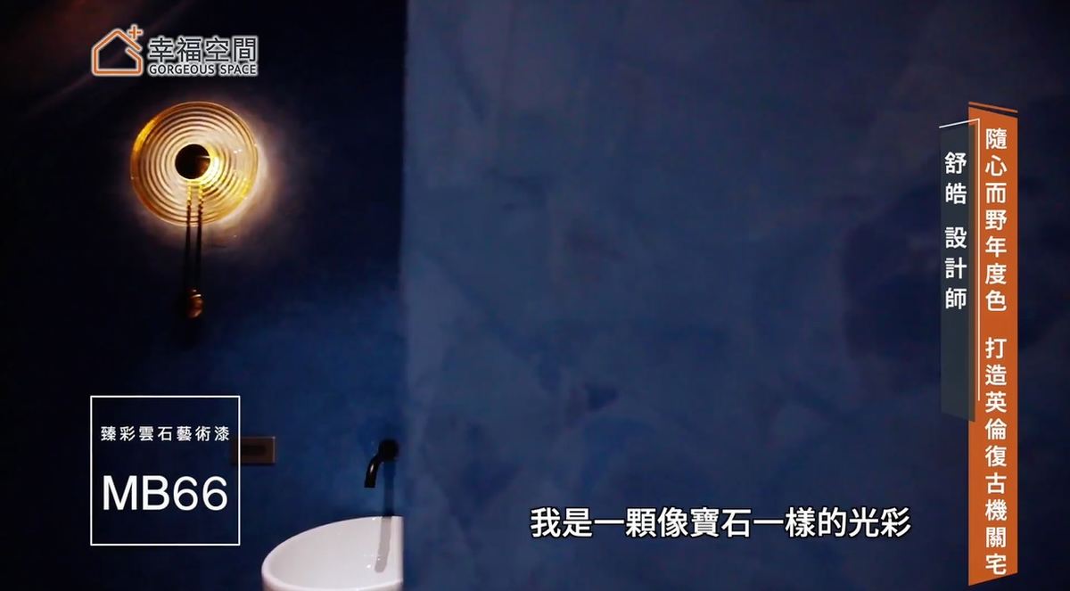 ▲客廁全室以臻彩雲石藝術漆(色號MB66)抹鏝,藍寶石一般地吸引眾人目光