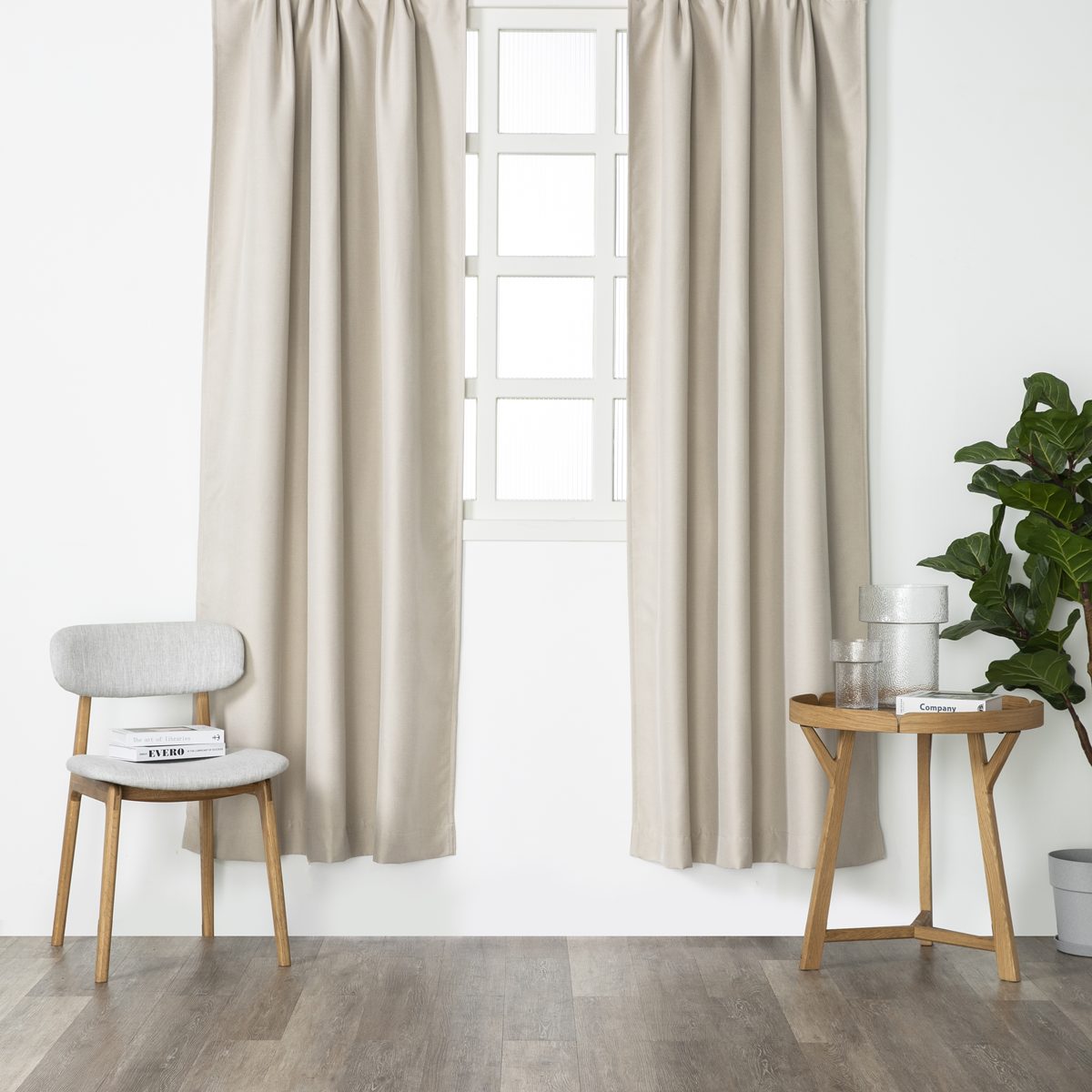 若搭配「PALETTE仿麻全遮光落地窗簾」,空間降溫效果就能更上層樓,窗簾採用日本遮光紗線與三明治一級遮光布料,不但能有效阻擋日曬熱氣,外層的仿麻質感也讓空間視覺更清爽自然,適用勾針式與穿桿軌道,安裝輕鬆又直覺。
