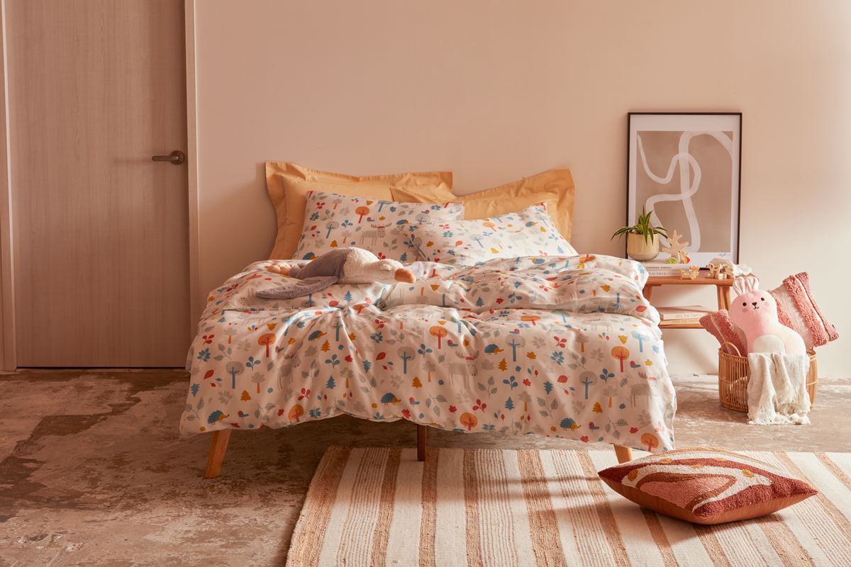 針對體溫高的小朋友,推薦換上「奇遇森林天絲防蟎抗菌床包」,同樣以吸濕排汗的100%萊賽爾纖維製成,降低兒童免於因體溫積累而產生的悶熱不適,同時導入經國家安全標準認證的防蟎抗菌技術,阻隔塵蟎與過敏源,給孩子一個安心無憂的睡眠環境。