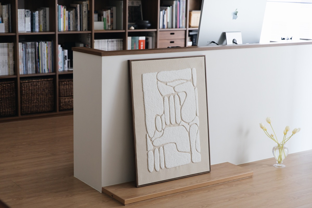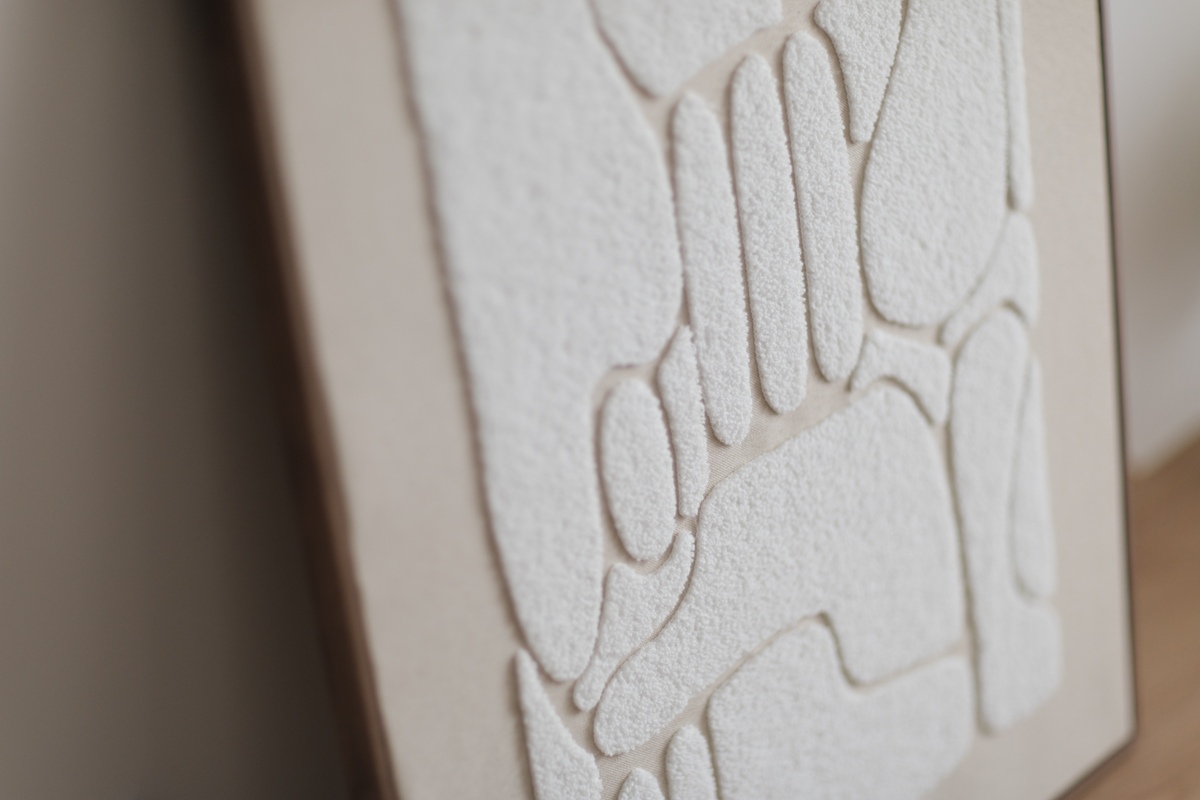 今年秋冬,HOLA推出多款老松木及簇絨工藝的藝術畫,其中奧可利絨面立體藝術畫(迷霧白)使用適合秋冬的簇絨工藝,毛茸茸質感,搭配潔白配色,有秋冬的氣質卻不會厚重,不規則圖形像雪地也像湖面漣漪,為家中增加一絲寧靜質感。