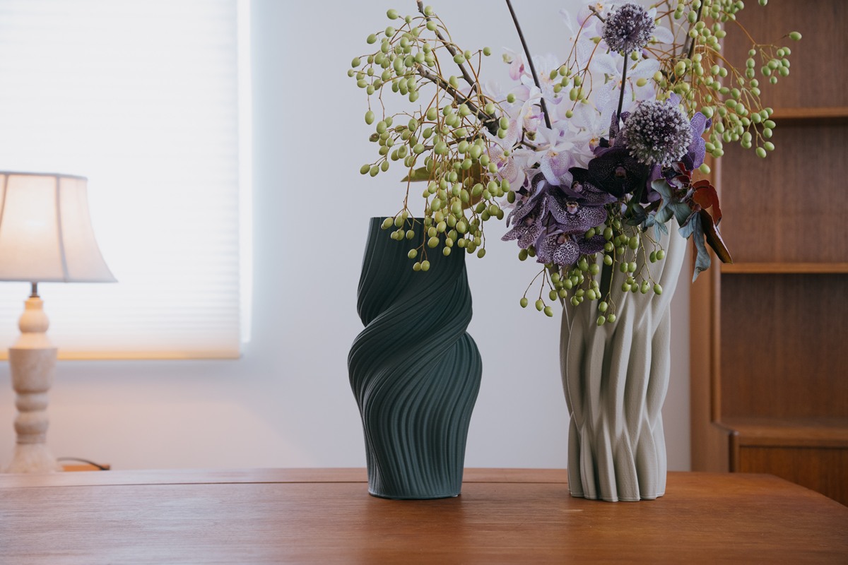由HOLA設計的查莉 3D 雕塑感陶瓷花器,跳脫傳統圓潤器型,使用 3D 列印打造像建築、雕塑一樣的立體線條,經過高溫燒製後,花器保有陶瓷特有的溫潤質感,同時更加輕巧好移動,內部列印時的細微刻痕,有助於固定花材,是一款非常適合新手使用的花器。