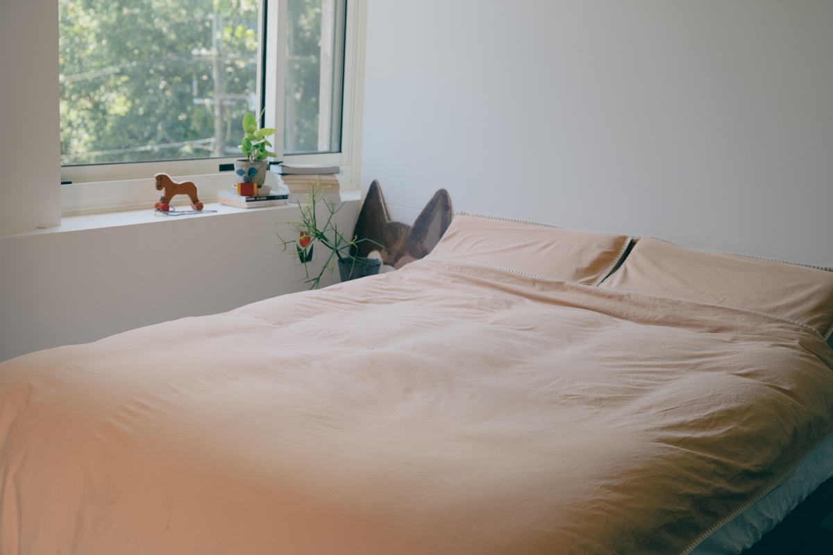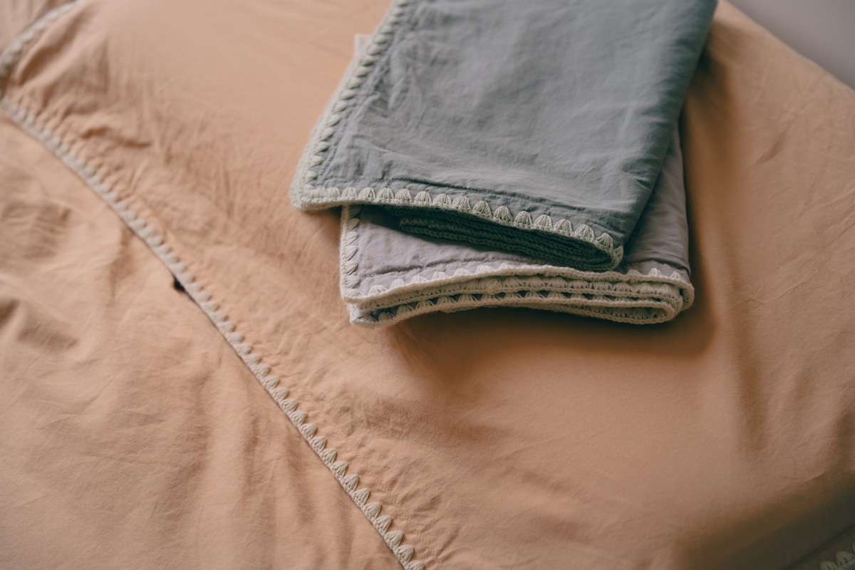材質上使用 100% 純棉,經特殊水洗處理後呈現自然的蓬鬆感與皺褶,卻不易變形,吸濕透氣的特性,更加適合台灣氣候。 除了舒適的材質,低飽和度的留白色彩及低調細膩的細節,也為空間注入活力。艾禮思山形繡 200 織水洗棉床寢提供灰、綠、橘三種色選,用色彩拂去秋冬的陰霾,枕套與被套四周,則以山形繡工藝勾勒出小貝殼般的弧線紋理,樸實卻吸睛。