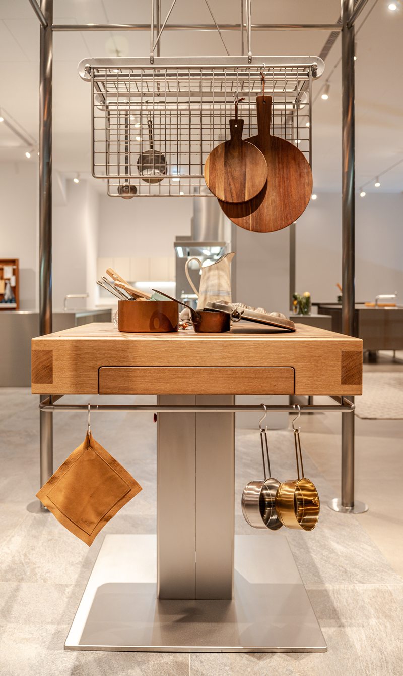由珍珠母貝、黑天鵝絨、羽毛、23K 金等珍稀材料創作的 DORNBRACHT Atelier 藝術龍頭系列,源於中世紀到 19 世紀歐洲藝術家,熱愛以工作室(Atelier)型態傳承美好設計理念和技藝,並以一件即能定制的個人化風格創作,體現尊榮與奢華的頂級服務。擁有建築廚房美譽的 bulthaup 更與楠弘攜手,將曾在歐洲展會造成話題的 vintage with rig 設計,完整呈現於全新門市之中。