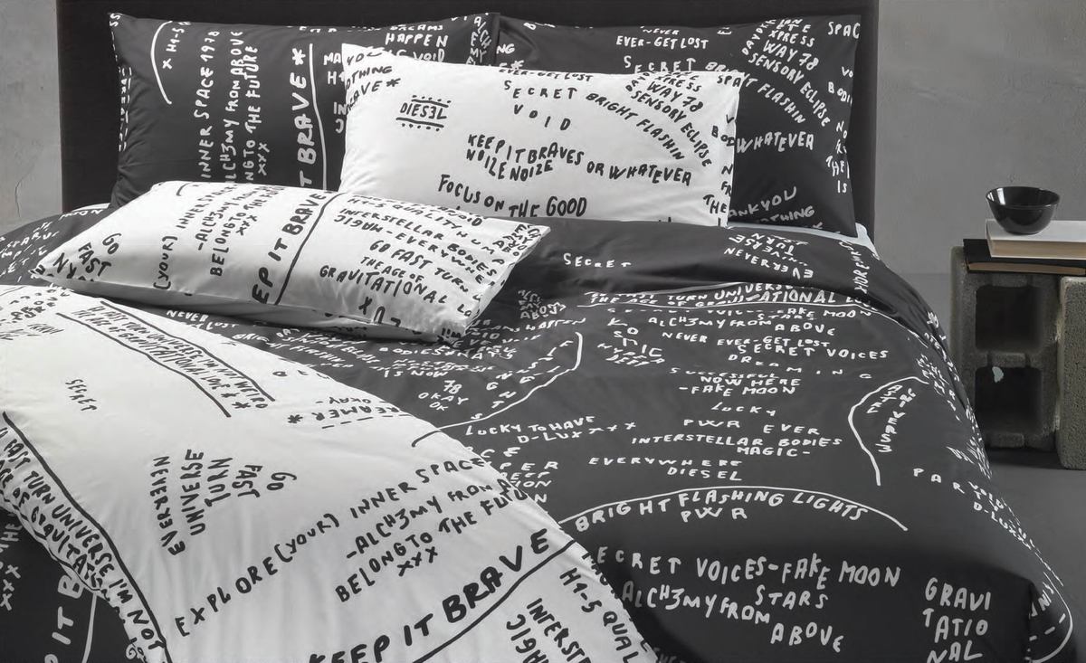 ▲DIESEL 原裝進口Scribbles數位印染雙人平單組,原價$14,800,特價$8,800。《輕鬆成家》享優惠價$2,500加購德國Advansa抗菌防螨可水洗雙人冬被一件(市價$3,980) 。(圖片提供/日比家族)