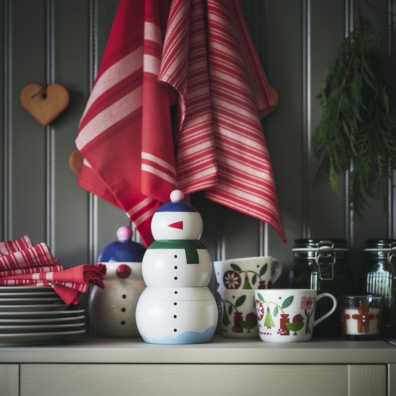 桌上的驚喜小物也不容忽略!VINTERFINT 雪人附蓋萬用罐採三層分層設計,不僅方便收納,更像聖誕餐桌上的趣味裝飾,放入糖果、堅果或爆米花,每一層都充滿驚喜!
