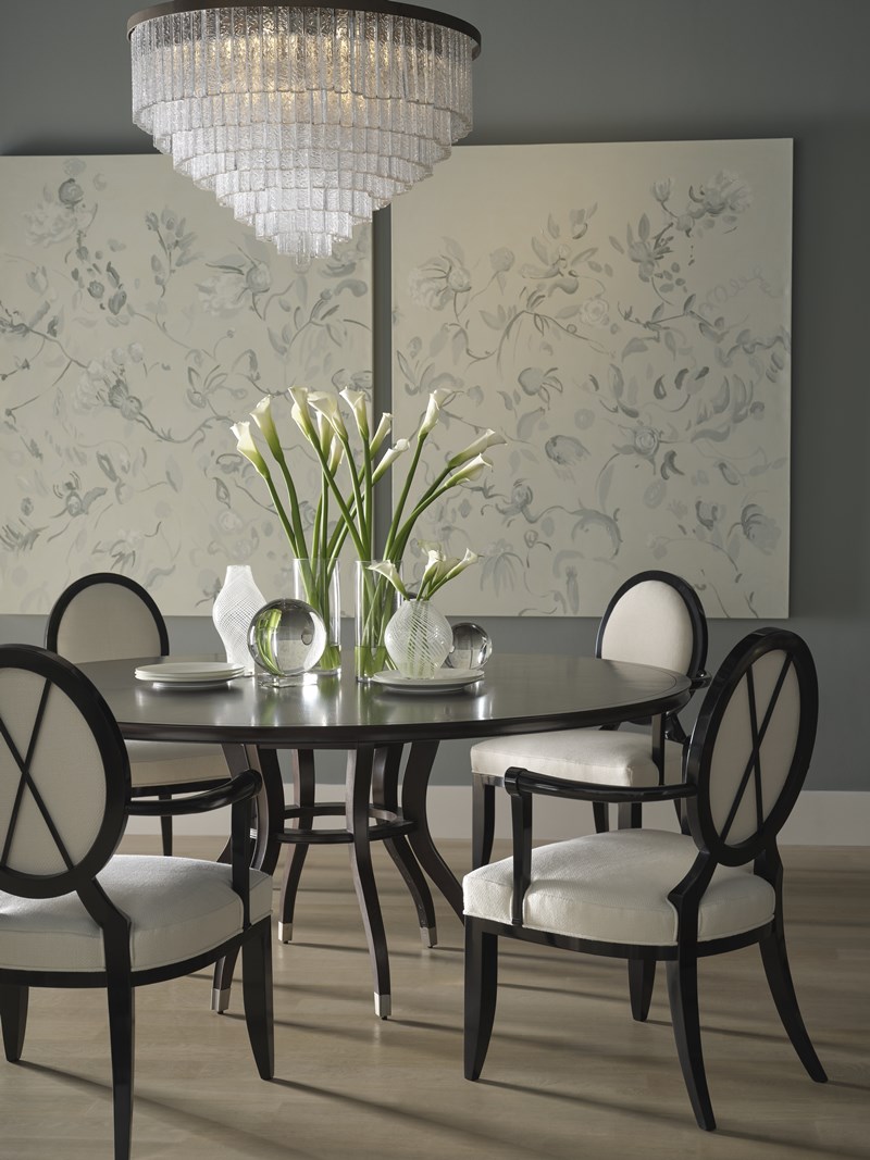 餐廳空間中,Laura Kirar 所設計的 Vienna Dining Table 以雕塑感桌腳與延伸桌板設計,兼顧宴客彈性與結構美感; Vienna Side Chair 則從珠寶層疊意象汲取靈感,椅背線條如畫框般勾勒,為用餐場域帶來細緻而穩定的視覺重心。