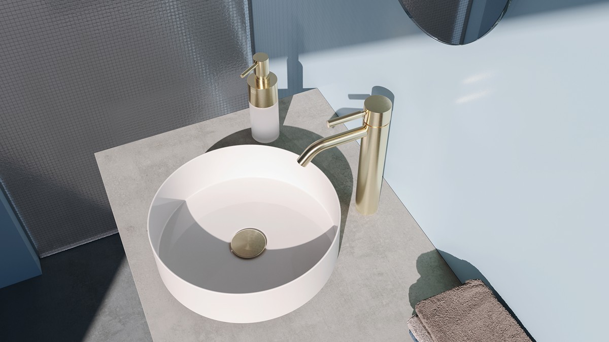 ▲▼Dornbracht META金色龍頭以俐落圓柱線條佇立檯面,在冷灰石材與霧藍牆面間形成和諧的對比。(圖片提供/楠弘集團)