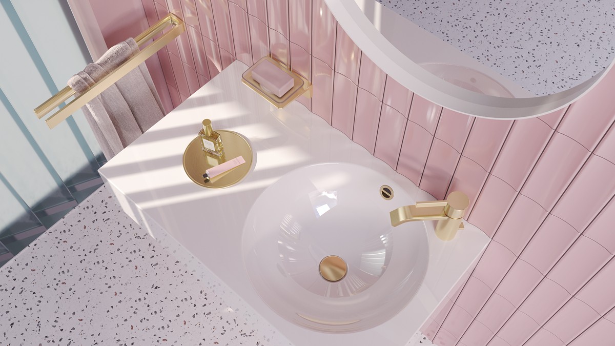▲▼Dornbracht IMO刷紋淺金色(Brushed Light Gold)龍頭,細膩的手工刷紋映射柔和光澤,於粉紅色設計襯托中更顯溫潤層次,為空間注入優雅且具當代感的視覺焦點。(圖片提供/楠弘集團)
