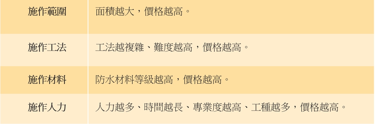 不同的漏水原因對應不同的工法;不同的區域或樓層,需要不同的施工設備與進出條件;不同的防水材質、不同等級的裝潢與家具保護,都會讓施工成本有所差別。舉例來說,同樣坪數的住家,一間是室內裝潢簡單的一樓公寓,搬運方便,管線很容易拉。另一間位於十五樓,建築後方是窄巷,車輛進不去,只能靠人工搬運與高空垂降施工,還有陽台或雨遮要閃避,加上室內還有許多高單價裝潢與傢俱需要保護避開,所耗費的人力、時間與技術條件,當然不可同日而語。
