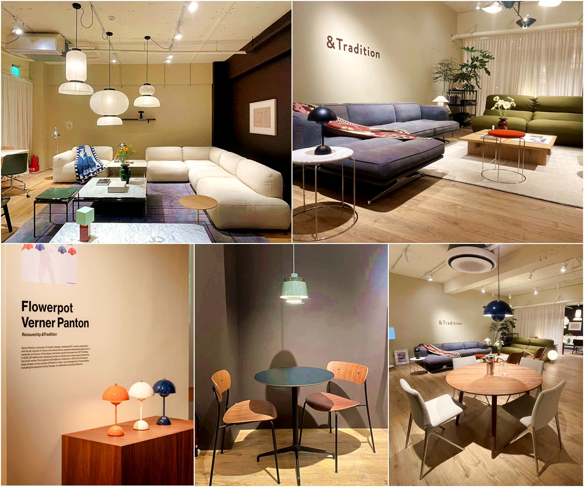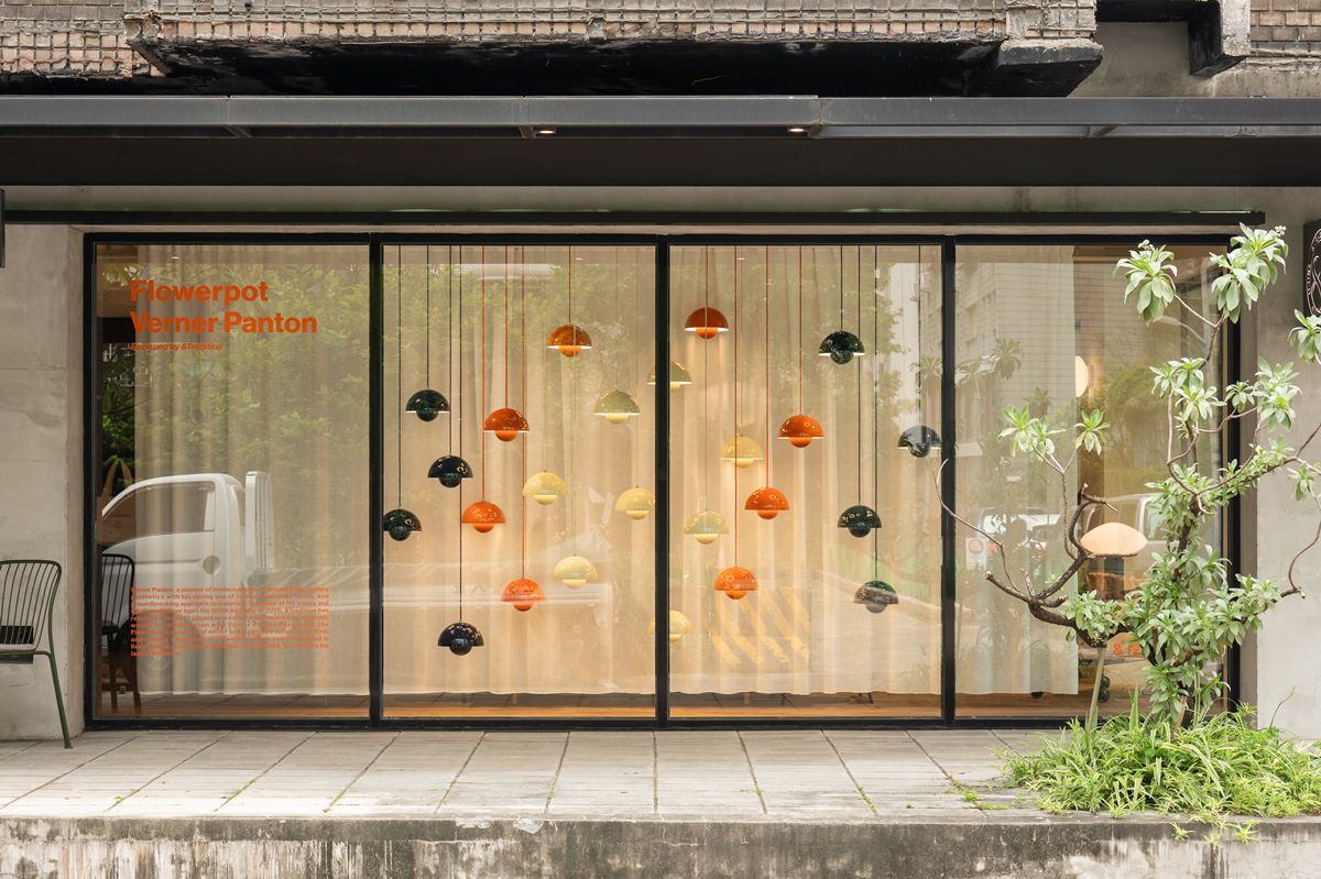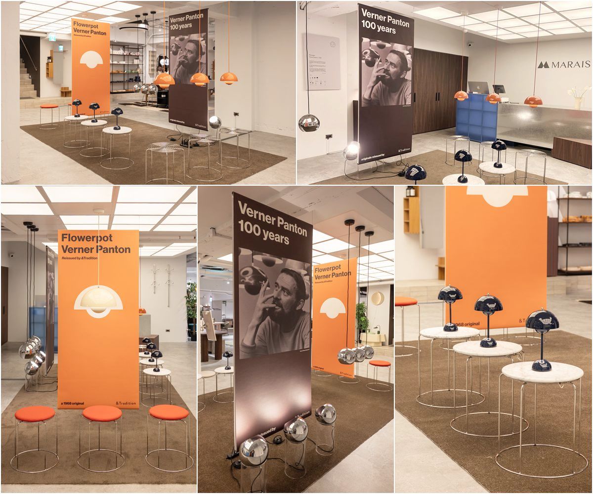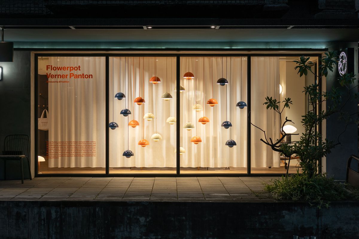 春季新品已於瑪黑家居台北仁愛店展售,&Tradition 亦透過櫥窗與空間陳列,延續 Verner Panton 對色彩、光與感知的探索。多盞 Flowerpot 燈具以高低錯落的方式懸掛,於立面之間形成具有節奏感的視覺流動,讓光不再只是照明,而成為空間敘事的一部分。